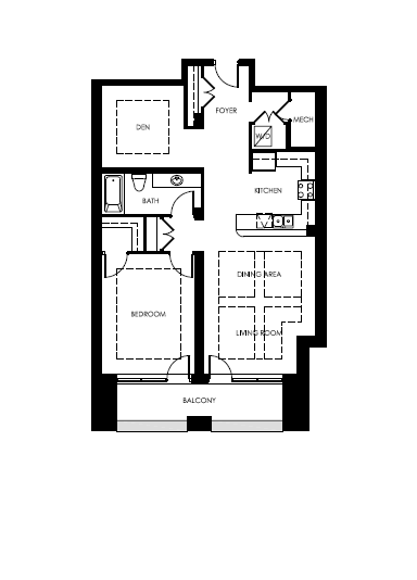 The Haycroft is a One Bedroom plus Den design positioned at the center of the building, with its balcony spanning the entire width of the suite and overlooking historic King Street.
